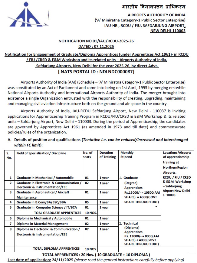 The Airports Authority of India has announced the Apprenticeship Recruitment for the year 2025–26 for its RCDU, FIU, CRSD and E&M Workshop units located at Safdarjung Airport, New Delhi. The notification invites applications from eligible degree and diploma holders for a one-year apprenticeship program under the Apprentices Act, 1961.This opportunity is particularly helpful for fresh graduates and diploma holders who want hands-on training in engineering, IT, accounts and related administrative areas. A total of 20 apprenticeship seats are available, equally divided between graduate and diploma apprentices