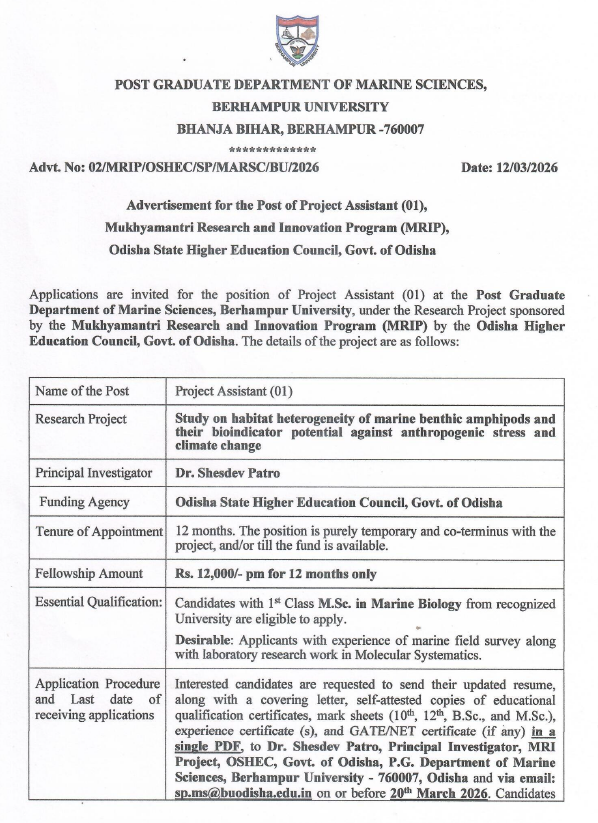 Berhampur University has released a recruitment notification for the post of Project Assistant under a research project funded by the Odisha State Higher Education Council. The position is available in the Post Graduate Department of Marine Sciences at Berhampur University, Odisha.