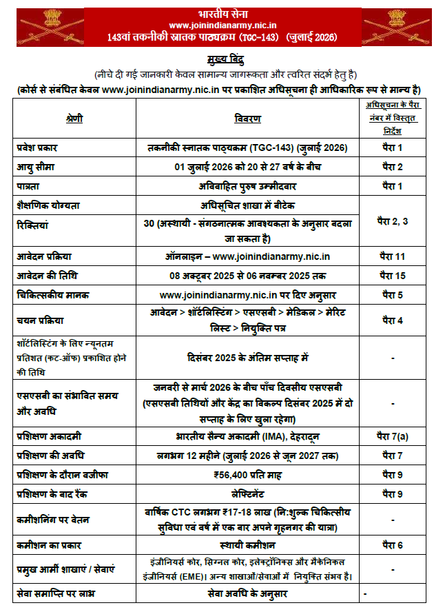 The Indian Army has released the official notification for the Technical Graduate Course (TGC-143) scheduled to begin in July 2026 at the Indian Military Academy (IMA), Dehradun. This recruitment is open to unmarried male engineering graduates who wish to serve the nation as commissioned officers in the Indian Army. The TGC entry offers a Permanent Commission and is one of the most respected ways for engineers to join the Armed Forces.