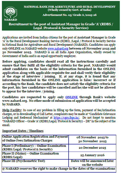 The National Bank for Agriculture and Rural Development (NABARD) has released its official notification for Assistant Manager in Grade ‘A’ positions for 2025–26. This recruitment drive includes vacancies under Rural Development Banking Service (RDBS), Legal, and Protocol & Security Services. Eligible Indian citizens can apply online through the NABARD website.