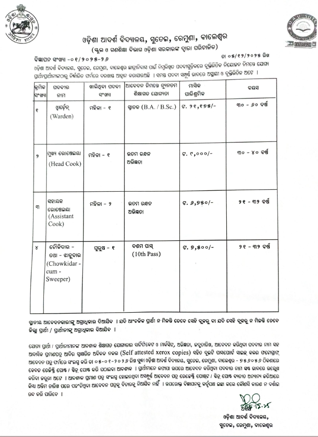 - Those candidates who is eligible and interested they can send their application in the prescribed format along with the self attested documents to the The Principal, Odisha Adarsha Vidyalaya, Sutei, Remuna, Balasore At-Sutei, Po-Chhanapur, Via-Kuruda, Dist-Balasore, Pin-756056 by Speed Post/Registered Post on or before 05.01.2026.
