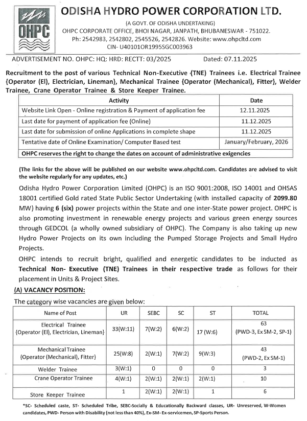 Odisha Hydro Power Corporation (OHPC) Limited has officially released a recruitment notification for the year 2025. The organization invites online applications from eligible candidates for various trainee-level posts including Management Trainee (MT), Diploma Engineer Trainee (DET), and Technical Non-Executive Trainee (TNE). This recruitment drive offers a total of 171 vacancies across multiple disciplines. Interested and eligible candidates can apply online through the official OHPC website before 11 December 2025.